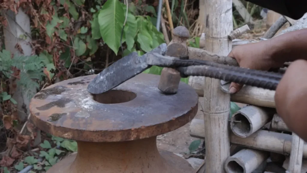 การตีแต่งทรงมีดเหมือนกันกับมีดไทย คือปั้นทรงให้ได้ตามที่ต้องการเสียก่อน จากนั้นจึงตีคมมีดให้เบี่ยงแค่ด้านเดียว ในขณะเดียวกันก็ต้องรักษาแนวระนาบอีกด้านของใบมีดด้วย ซึ่งพี่ช่างจะเอียงค้อนตี และถ้าจะให้ดีทั่งที่ใช้ควรเป็นทั่งหน้าเรียบค่ะ
